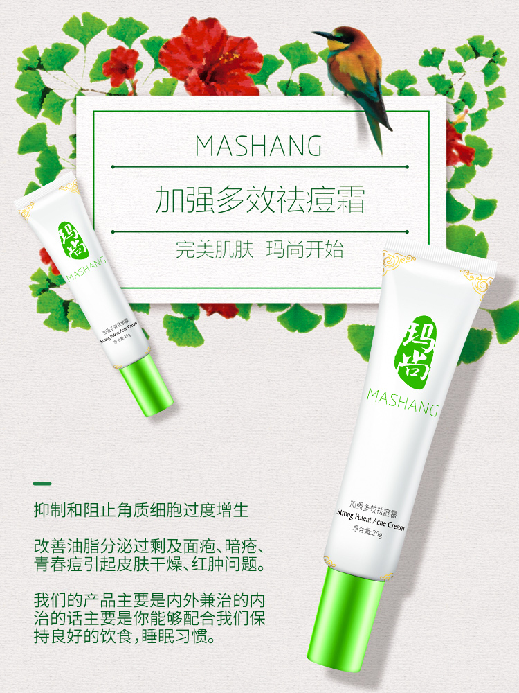 对于爱美人士来说,痘痘是拉低颜值的天敌,顽固的痘印更是很多人心头上的一大痛处,我们都希望拥有无暇的美肌,无奈痘痘总来作怪,这可怎么办?你不能少了一个适合自己的祛痘霜,今天展开玛尚护肤小讲堂:玛尚祛痘霜让你不再“痘”留篇章,给大家介绍一款超能祛痘霜。 产品名称:玛尚加强多效祛痘霜