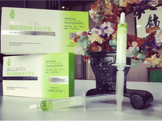 “打开针管前端旋盖,轻轻推出精华(每次前推1CM)于掌心。将产品均匀涂抹全脸,将掌心预热后,按压脸部肌肤,轻轻按摩至吸收即可。” 这说的是“水光针”的用法,会有小伙伴认为实在是太简单了吗?不过这的的确确是“玛尚祛痘淡印涂抹式水光针”的使用说明。 关注美容市场行情的人士都知道,“水光针”是韩国新近推出的高端美容技术。从名字中就可以看出,“水光针”是要用来注射的。到哪去注射?当然是美容院或者是有资质的医院。虽然很多人为肌肤美白不惜代价,但是隔三差五就要跑医院扎针,也确实够麻烦的。再说,注射式水光针既然属于“微整形”,就难免有这样那样的副作用。